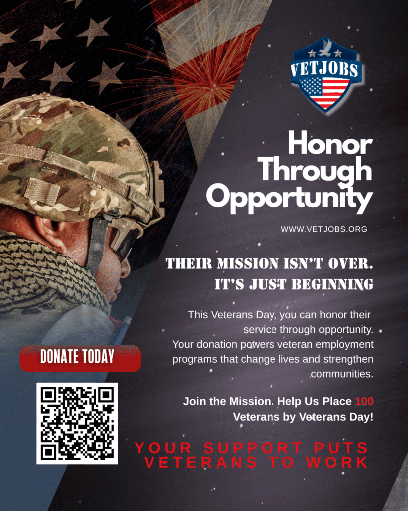 Our Board Members are all VOLUNTEERS, who pay their own way to board meetings twice a year. We never hire consultants, or vendors to create our marketing materials, websites, payroll, grant development and business development. Everything we do for our mission remains in-house. We do not own buildings or property of any kind. We all work from home offices. We have ZERO overhead in this regard. Activision’s Call of Duty Endowment, places VetJobs under a week-long stringent review of our program’s outcomes and financial health and transparency, via Deloitte. We remain Call of Duty Endowment’s number one nonprofit since 2014. VetJobs is a trusted, credible, efficient nonprofit organization, which carries a long history of successful metrics, financial health and sustainability. We think long-term and legacy here.”